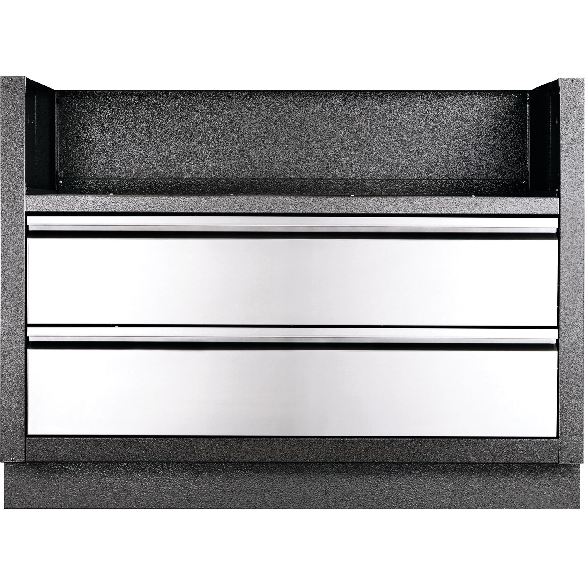 Specially made for the Built-In 700 Series 44" Gas Grill Heads, this carbon colored, powder coated, galvanneal cabinetry features increased durability from the two-coat pebbling finishing system. Two stainless steel drawers are mounted on smooth gliding tracks for under grill storage. Installation is a breeze with knockouts for gas and electrical. Levelling feet ensure a balanced surface, even if your patio isn't perfectly level.