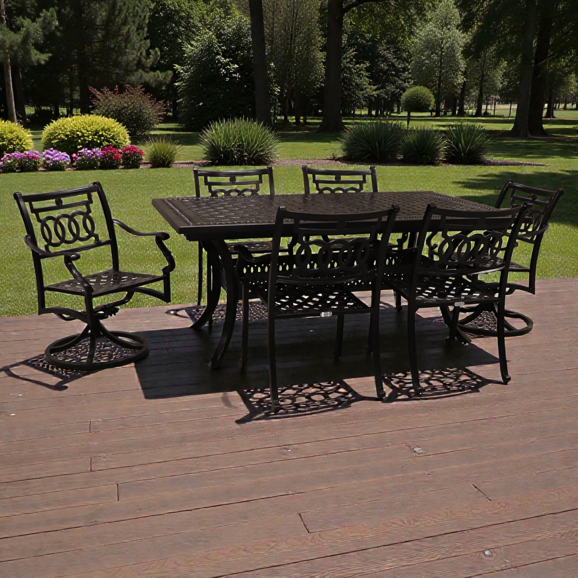 Create an inviting outdoor dining experience with this elegant ensemble. The Verona collection captures the romance of vintage European design through ornate cast-iron construction, complete with woven seat details and decorative medallion accents on each chair back. Pair it with the 72" Pure Table for a cohesive, sophisticated look that transforms your patio into a refined gathering space. Add optional cushions for enhanced comfort, or enjoy the timeless appeal of the bare design. A stunning investment in outdoor living that never goes out of style.