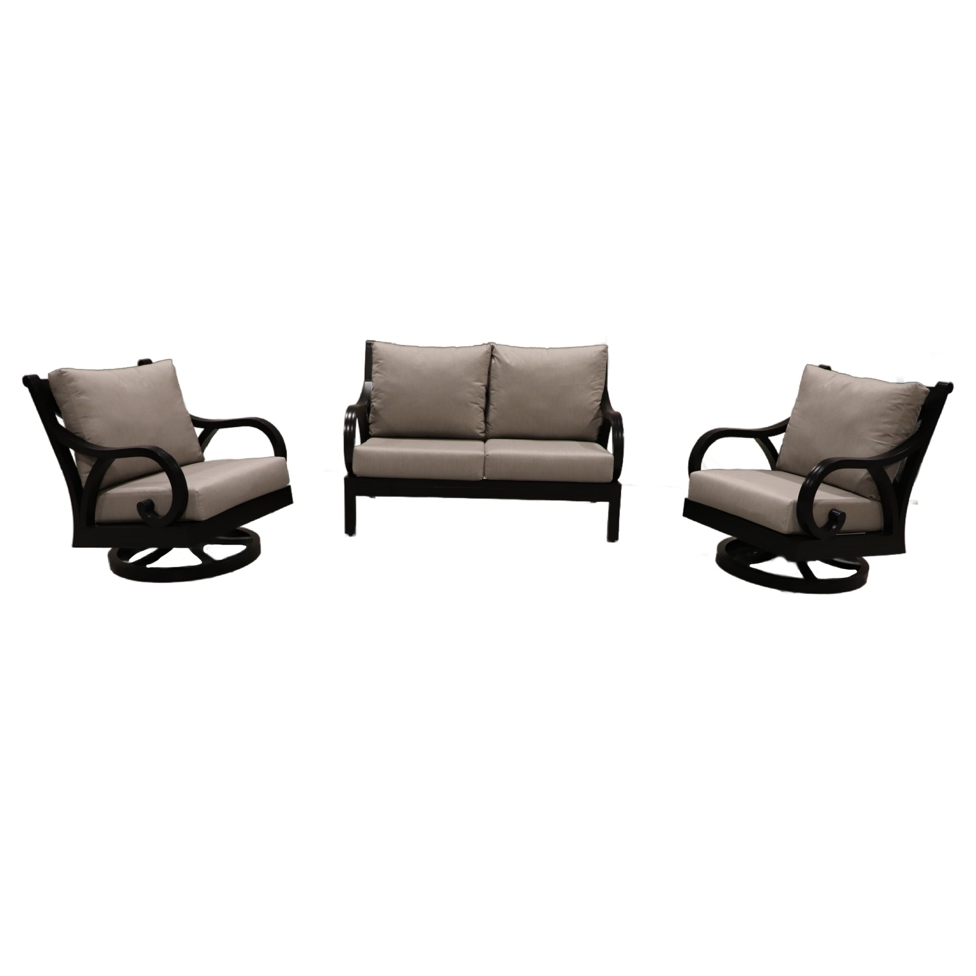 Set includes: 2 Milano Swivel Club Chairs, 1 Milano Loveseat & 4 Cushion Sets Pictured:Frame Colour: Black, Sunbrella Cushions: Spectrum Dove