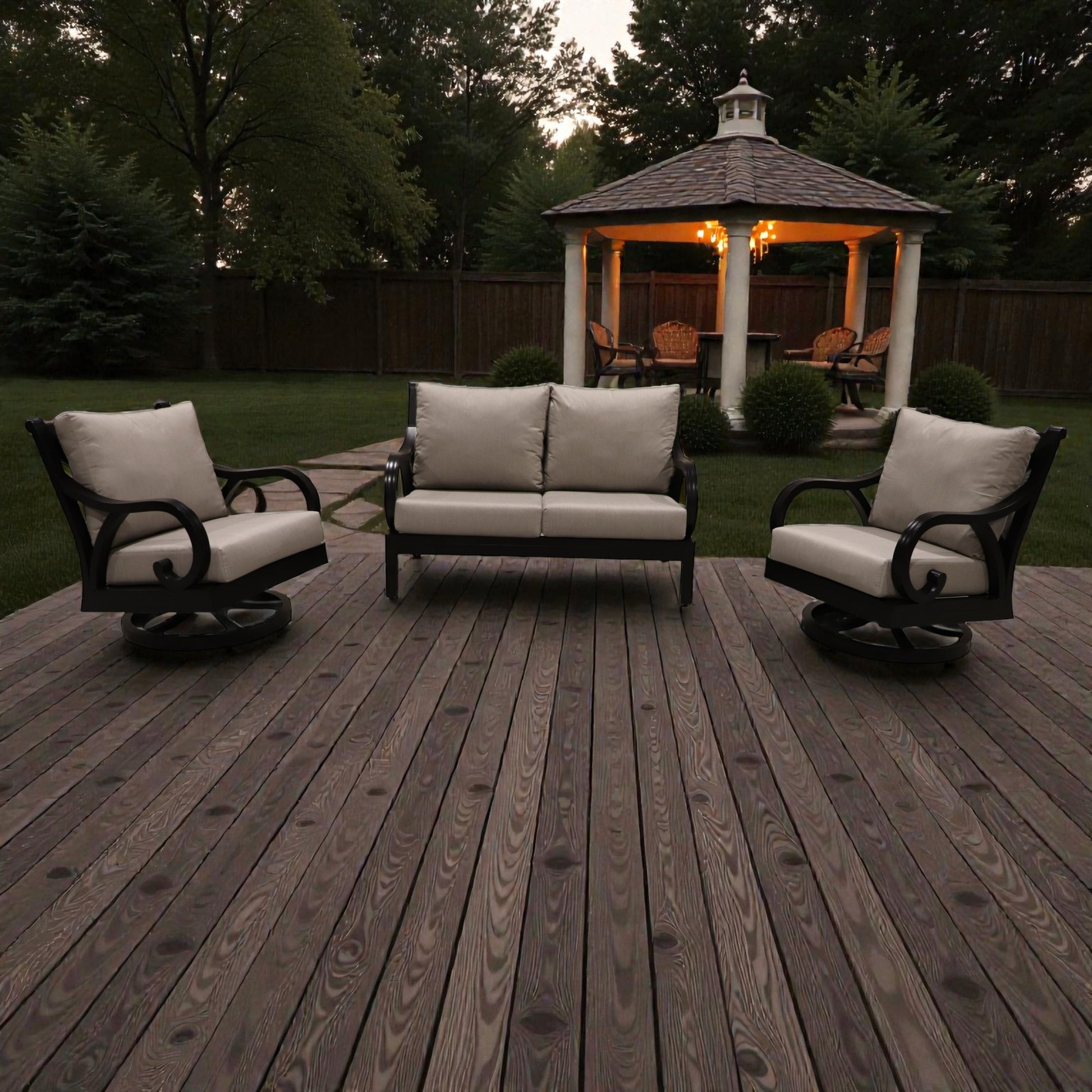 Elevate your outdoor entertaining with the Cabana Coast Milano Loveseat with Swivel Chairs Set. This sophisticated collection makes a bold design statement through its signature flowing curved armrests and distinctive X-pattern backrest detailing. Perfect for those who appreciate refined aesthetics, Milano combines contemporary flair with timeless elegance, creating an inviting focal point for your patio or garden retreat.