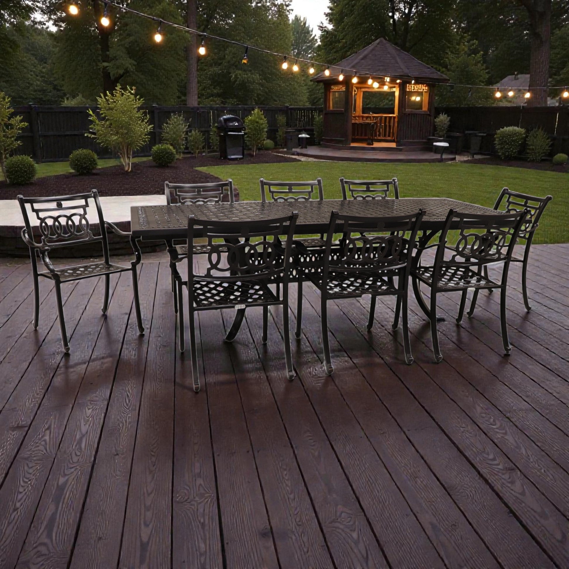 Elevate your outdoor entertaining with this sophisticated dining collection that seamlessly blends timeless elegance with practical functionality. The Verona chairs showcase exquisite cast-iron craftsmanship, featuring intricately woven seats and ornamental medallion details that evoke classic European charm. The expansive Pure Extension Table, complete with two butterfly leaves and umbrella hole, provides flexible seating for intimate dinners or larger gatherings. Whether you choose to enhance comfort with optional cushions or embrace the striking bare design, this curated set delivers enduring style and quality that transforms your patio into an upscale outdoor sanctuary. An investment in refined outdoor living that transcends seasonal trends.