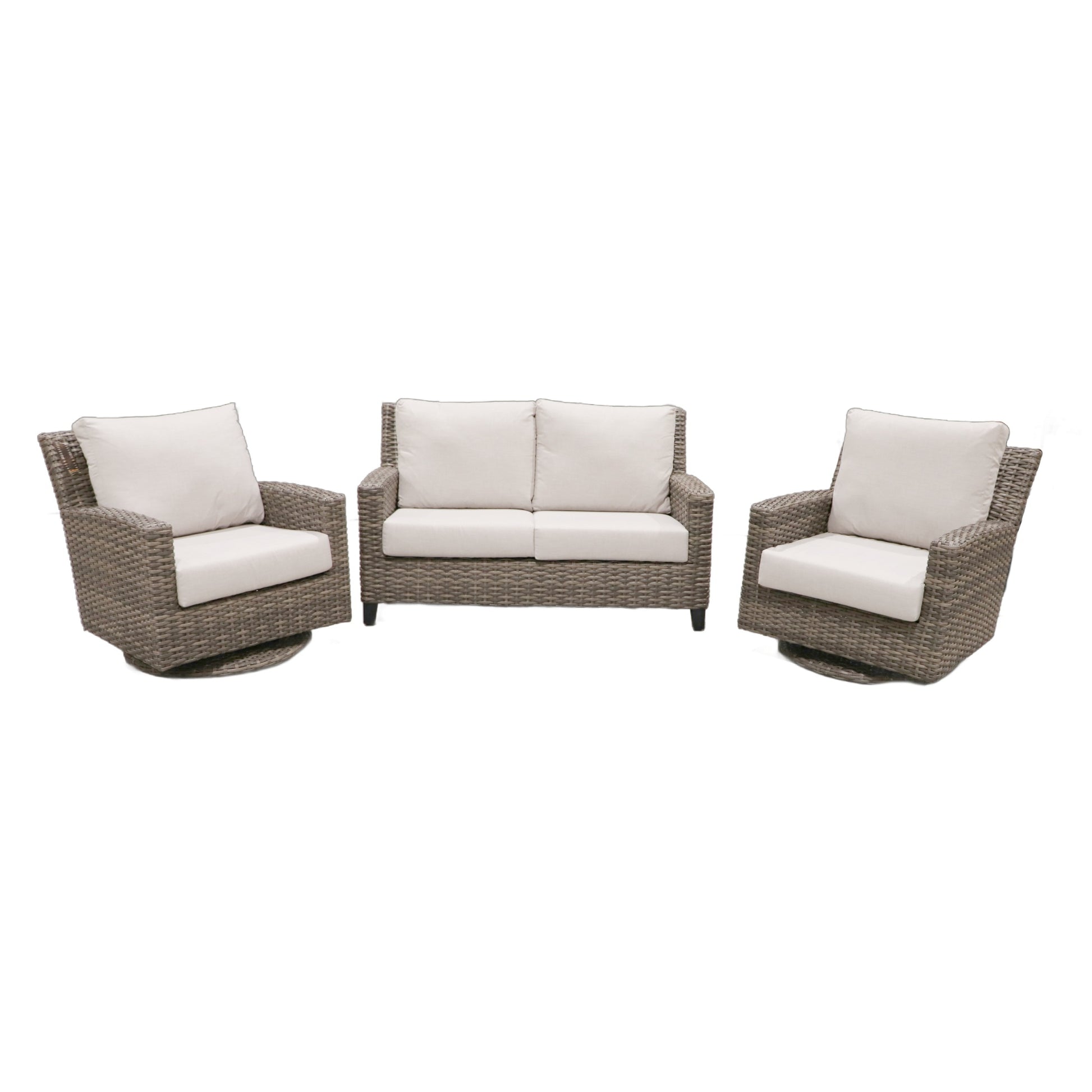 Set includes: 2 x Sedona Swivel Glider Chairs + 1 Sedona Loveseat + 4 Cushion Sets