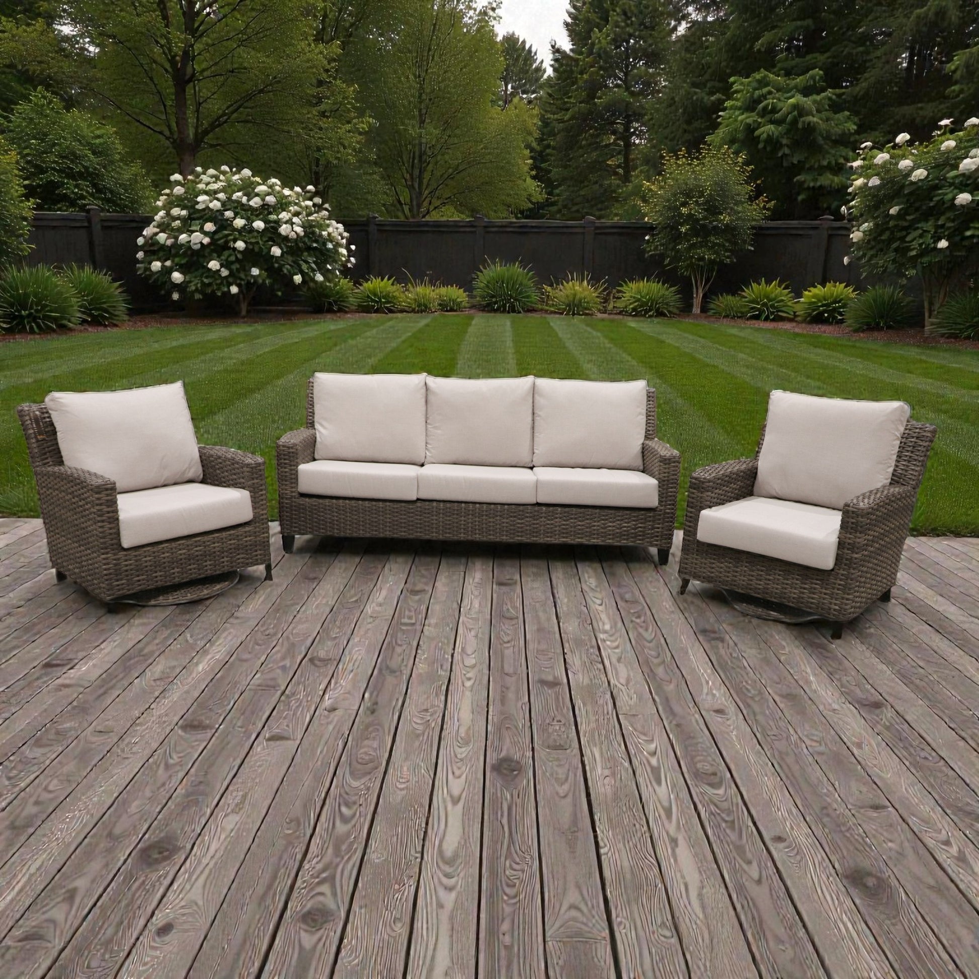 Set includes: 2 x Sedona Swivel Glider Chairs + 1 Sedona Sofa + 5 Cushion Sets