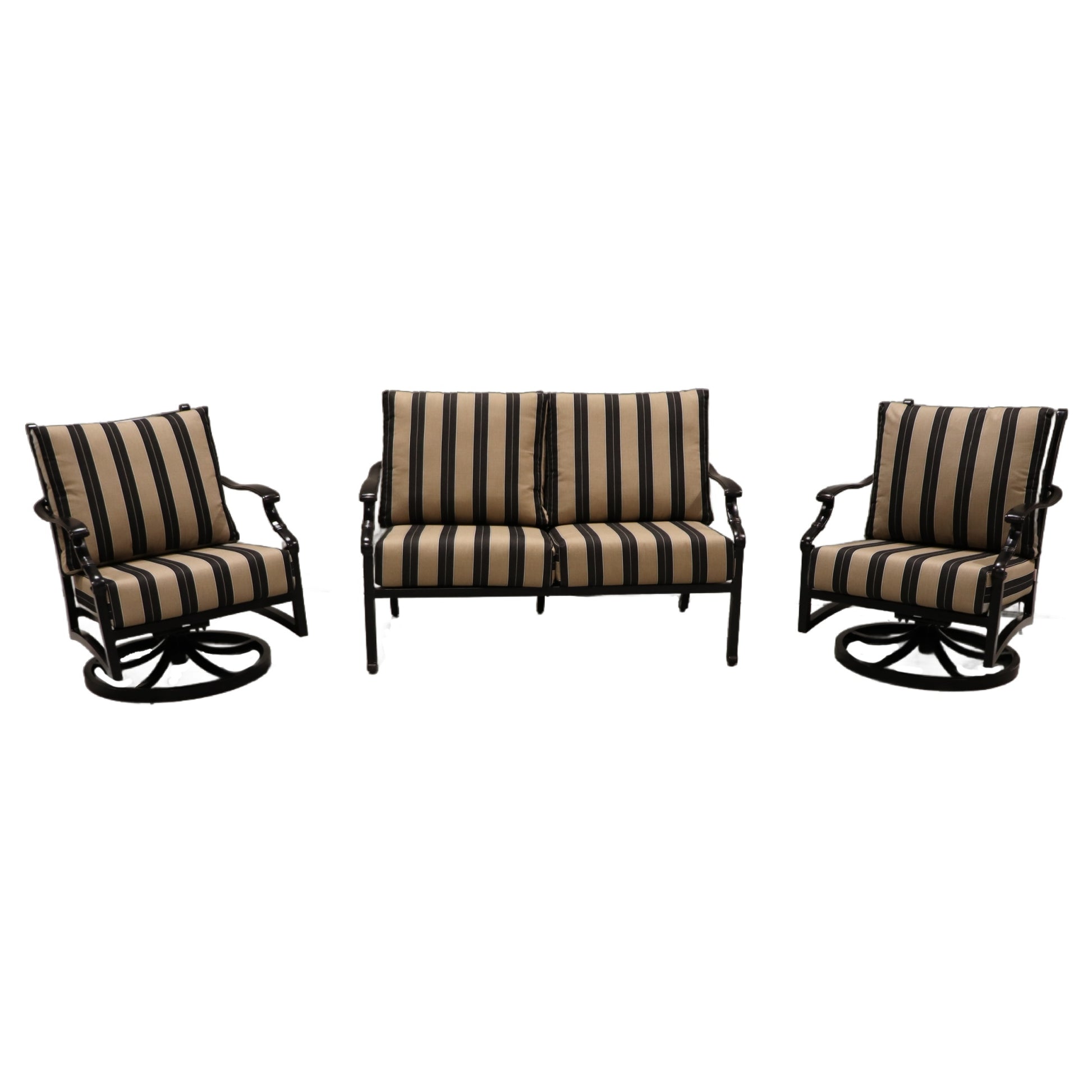 Elevate your outdoor space with the timeless elegance of the Cabana Coast Verona collection. This sophisticated loveseat and swivel chair set showcases ornate cast iron-inspired design with intricate basket weave seating and beautifully detailed medallion patterns adorning each chair back. Perfect for creating an inviting patio retreat, the Verona set combines classic aesthetics with enduring quality, transforming your garden into a refined outdoor sanctuary.