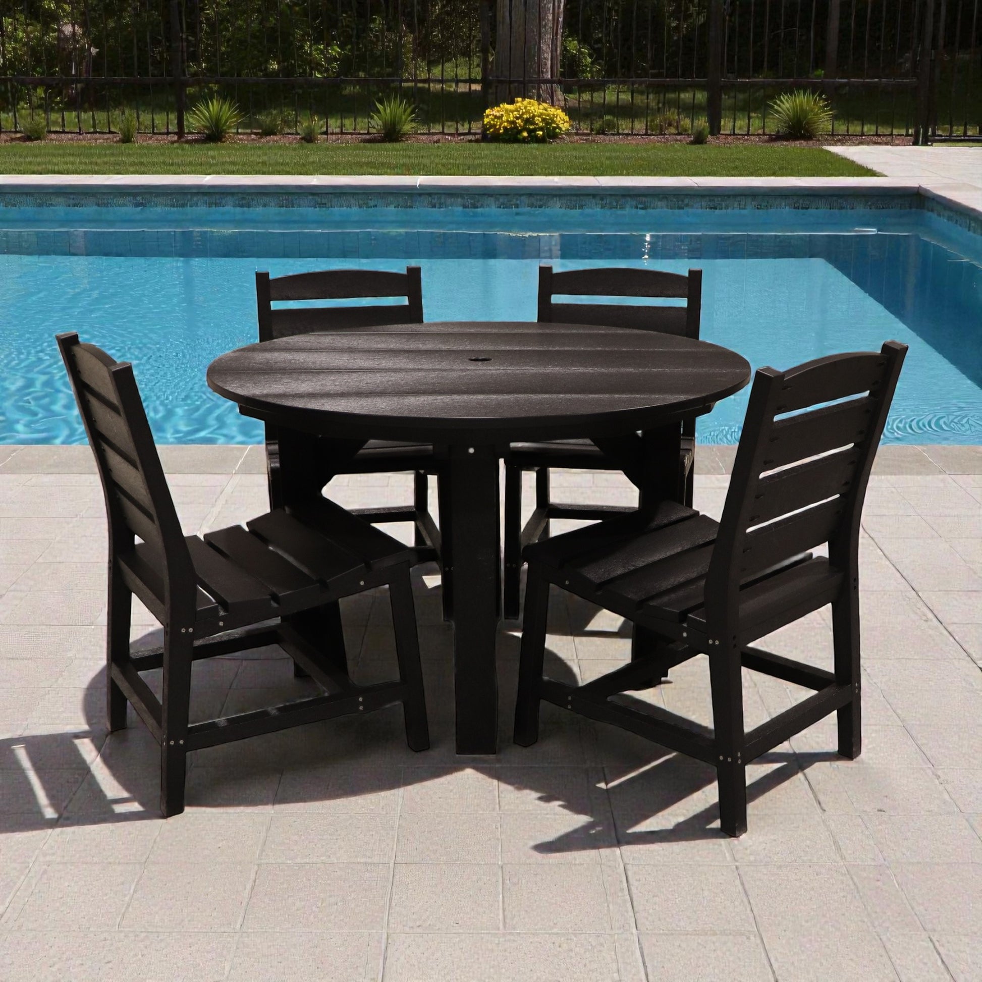 This exquisite 48" Dining Table with Napa Side Chairs comfortably seats four and is designed to endure all weather conditions, making it the perfect addition to any environment. Great for patios, decks, balconies and smaller spaces, this set will compliment any home and last a lifetime.