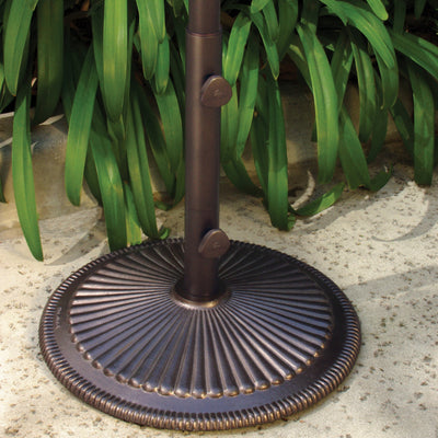 Designed for outdoor dining tables that need reliable support without bulk, this 35 lbs. flat steel base delivers stability where traditional umbrella bases fall short. The powdered-coated finish resists the elements while maintaining a refined appearance, and the patented dual-purpose stem adapts to your table's unique requirements. Its streamlined profile works seamlessly in under-the-table installations, making it the ideal solution for compact or lower-profile dining setups. Experience the perfect balance of durability and elegance for your patio.